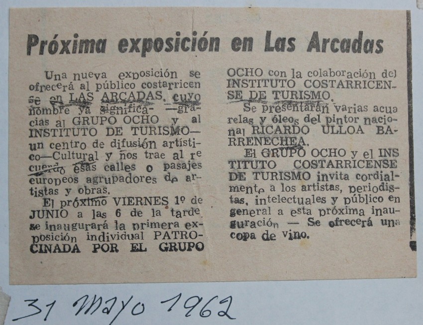 | dc.description | Nota sobre la exposición de óleos y acuarelas de Ricardo Ulloa B. que se llevará a cabo en Las Arcadas, bajo el patrocinio del Grupo 8. En esta se comparten diversos detalles pertinentes a la muestra. No se cuenta con información sobre su autor o medio de publicación. | |