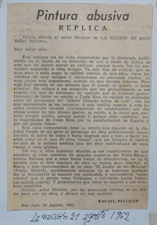 | dc.description | Nota publicada en el periódico La Nación, en el que el pintor Rafael Pellicer se dirige al director de La Nación y responde ante una crítica que se le hizo en este mismo medio unos días atrás. | |